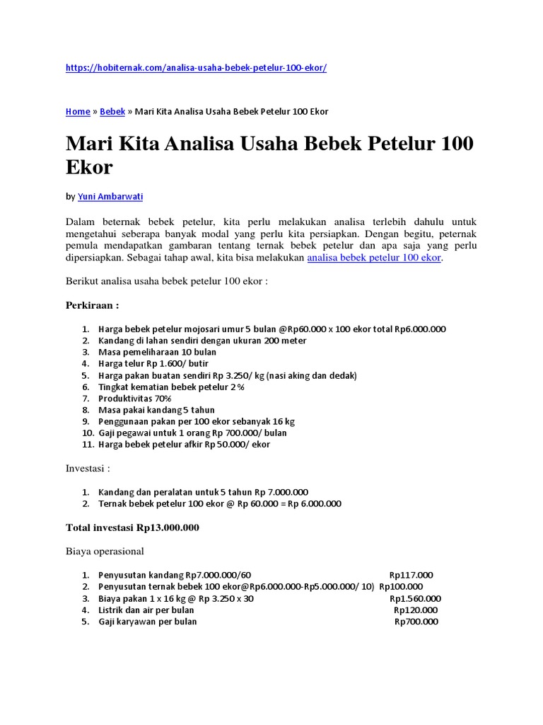Analisa Usaha Bebek Petelur 100 Ekor