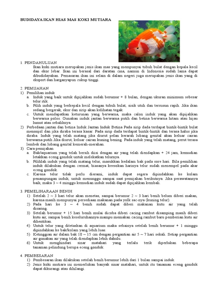 Cara Pembenihan Budiaya Ikan Mas Koki Mutara Alam Ikan